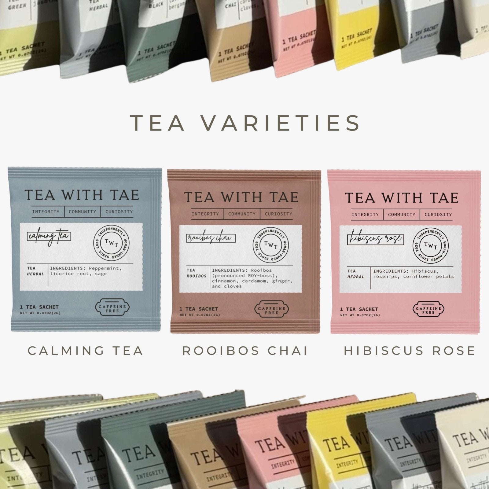 • Individually Wrapped Tea Sachets: Pyramid-style sachets from Tea with Tae; flavors may vary for a soothing, comforting cup of tea
